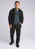 Брюки с отрезным поясом из кашкорсе, двумя карманами в боковых швах и одним накладным карманом сзади.