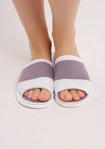 Домашние тапочки с открытым носом из хлопкового трикотажного полотна, сверху нашивка. Толстая подошва.