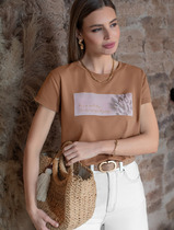 Акция Vilatte Футболка из эластичного хлопка с принтом стразы D49.097 карамельн