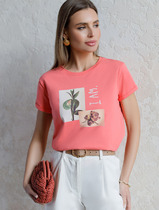 Акция Vilatte Футболка из эластичного хлопка с принтом стразы D49.097 коралловы