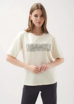 Футболка прямого силуэта из плотного трикотажного полотна. Со спущенным рукавом длиной до локтя. Круглый вырез горловины.