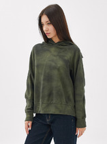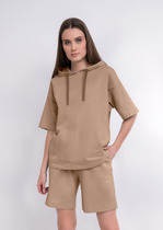 Объемный джемпер из футера с капюшоном. Спущенная линия плеча. Рукав до локтя. На детали переда карман-кенгуру.— Описание у На сайте поставщика