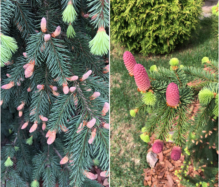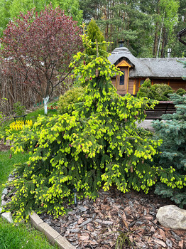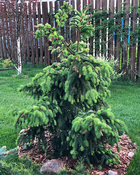 Скорость роста - 15-30 см в год. Может расти кустом, без выраженного лидера. Её характерной чертой являются большие шишки, необычным образом расположенные на концах побегов, весной красного цвета, зрелые - светло-бурые, свисающие вниз. Шишки появляются даже на молодых 3-5 летних елочках. В целом ель имеет вид невысокого, 3−4 метра деревца, с ширококонической кроной, ветки которой демонстрируют тенденцию склоняться к земле. Таким образом, растение приобретает слегка «плакучую» форму. Нижние ветки стремятся лечь на землю, вытягиваясь по её поверхности в разные стороны.