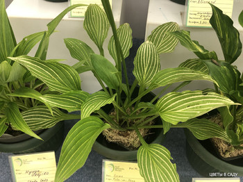 полосатая хоста с вертикальной формой роста, лист удлиненный с частыми желтыми полосами, к середине лета хоста зеленеет Н-35см  Ø 50см