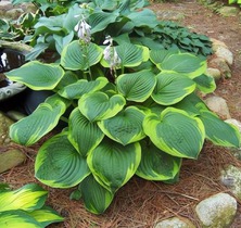 полосатая хоста с вертикальной формой роста, лист удлиненный с частыми желтыми полосами, к середине лета хоста зеленеет Н-35см 50см
