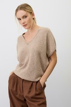 Джемпер свободного объема из трикотажного полотна плотное пике. Округлая горловина с вязаной обтачкой. Длинный рукав со спущенной линией плеча. По переду рельефы с декоративной тесьмой люрекс, внизу разрезы. По спинке средний шов. Спереди принт.