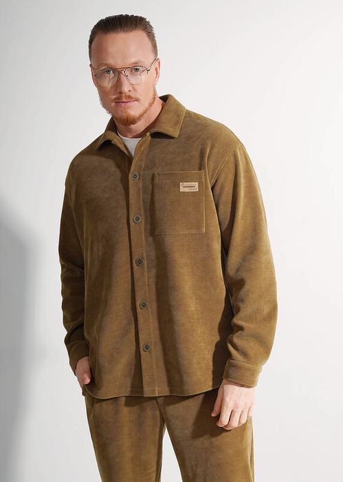 Мужская куртка-рубашка выполнена из трикотажного полотна вельвета, свободного силуэта с отложным воротником и застежкой на пуговицы. Модель дополнена нагрудным карманом и имиджевой фурнитурой. По низу рукава манжета. Отлично подойдет для работы и учебы.