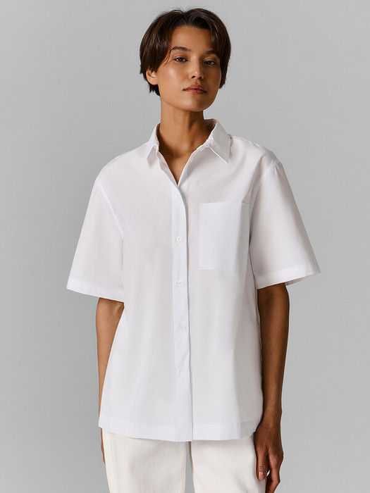 Блузка женская свободного силуэта из ткани. Блузка с цельнокроеной планкой и центральной застежкой на пуговицы. На левой детали переда накладной карман.