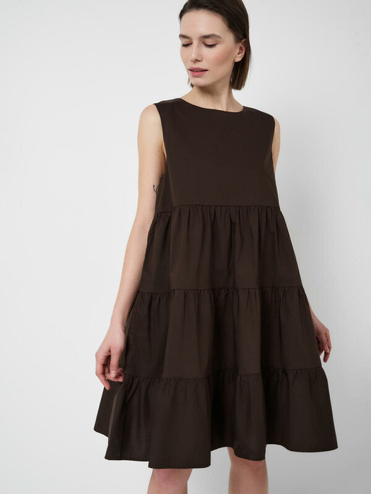 Женское платье свободного силуэта. Выполнено из лёгкой хлопковой ткани поплин. Модель в длине миди, состоит из присборенных блоков, за счёт чего юбка выглядит объёмной и летящей. Спереди — классический лаконичный вид, сзади — небольшая застёжка на пуговицу.