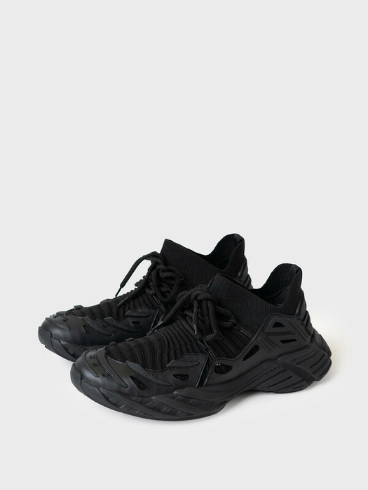 Трендовые кроссовки футуристической формы мужские. Верх кроссовок выполнен по технологии socks из тянущегося дышащего трикотажа. Их можно обувать не развязывая. Нижняя часть защищена крупной ПВХ деталью. Крупные шнурки придают актуальности модели. Стелька - текстильная, съемная. Для придания прочности подошва дополнительно пристрочена к верху.