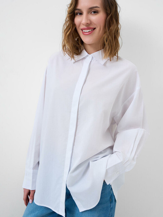 Женская белая рубашка. Модель свободного кроя выполнена из лёгкого материала. Удобная застёжка на пуговицы. Классический отложной воротник, длинные рукава с манжетами на пуговицах. Нижний край рубашки красиво округлён.