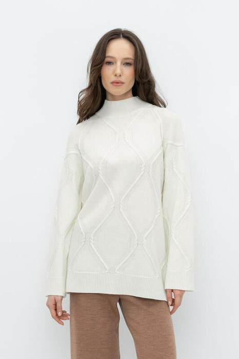 Уютный вязаный джемпер с красивым вывязанным узором и воротником-стойкой из полушерстяной пряжи. Шерсть мериноса в составе сохраняет тепло, а волокна акрила добавляют мягкость и объем. Комфортная посадка и спущенные плечи придают изделию объем.