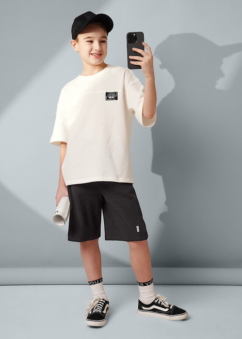 Чёрные шорты из пике для мальчика. Модель с декоративным резом по переду и вшивкой. Удобные карманы, пояс на резинке с регулировкой — комфорт и стиль в каждой детали.Сочетай модель с футболками из новой коллекции и будь в тренде!