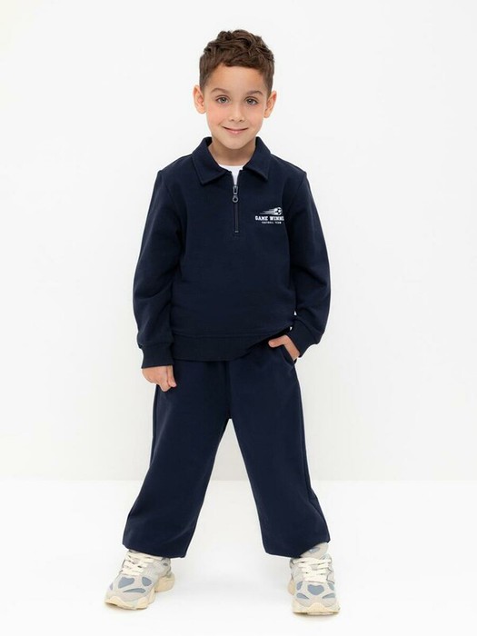 Трикотажные брюки для мальчика из петельчатого футера. Эластичный пояс на резинке регулируется по ширине с помощью шнурка. По бокам два удобных кармана. Внизу эластичные манжеты на резинке.