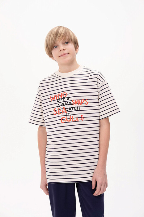 Футболка для мальчика свободного кроя  - это идеальный выбор для активного ребенка. Вырез горловины обработан эластичной тканью — она прекрасно держит форму, не растягивается, при этом ребёнку удобно надевать и снимать футболку.По переду принт с надписями. Перевод принта "wind, ships, sea, gulls" - ветер, корабли, море, чайки, "life's a wave catch it" - жизнь это волна, ловите ее. Спортивная футболка подходит как для малышей в детский сад так и для подростков. Она подходит для любого времени года, её можно носить как летом, так и в холодное время года в качестве среднего слоя одежды. Помните о правильном уходе за изделием: рекомендуется стирать при температуре не выше 30 °C, без предварительного замачивания, с изнанки. Это поможет сохранить качество и цвет футболки на длительное время.