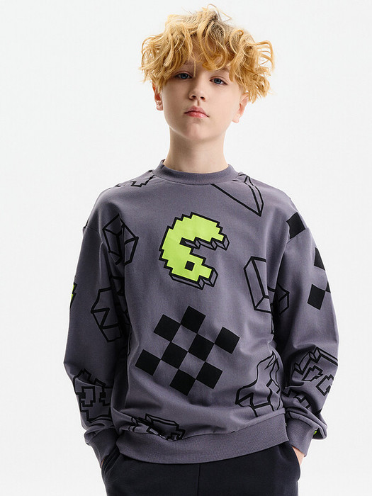 Свитшот без начеса из материала футер-петля. Манжеты и низ изделия из рибаны. Толстовка украшена принтом Pac-man (пакмен) и тетрис. В составе ткани преобладает высококачественный хлопок — спортивная кофта приятна на ощупь и прекрасно пропускает воздух. Тонкую кофту можно носить круглый год. Размерная сетка подойдет для подростка. Удобно надевать нижним слоем под куртку осенью и зимой.