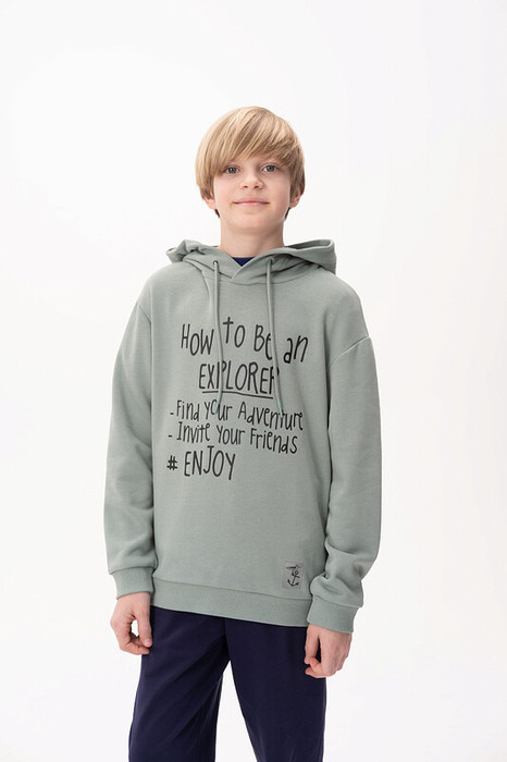 Худи для мальчика без начеса – актуальная вещь в любом сезоне, будь то весна, лето или осень. Кофта спортивная для мальчика выполнена из плотного футера-петля, который отлично согревает в прохладную погоду и при этом хорошо пропускает воздух – ребенок активно двигается, играет, не потеет. Толстовка свободного покроя оверсайз со спущенным плечом, углубленной проймой. Рукава а также низ изделия на манжете из рибаны. Кофта без карманов. Капюшон с регулировкой объема. По переду изделие украшено принтом с надписью и нашивкой. Перевод надписей "how to be an explorer: find your adventure, invite your friends, enjoy" - как стать исследователем: найди свое приключение, пригласи своих друзей, наслаждайся. Размерный ряд подходит как для малышей так и для подростков.
