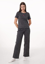 Сорочка женская из трикотажного полотна «кулирка» с набивным рисунком, свободного кроя, слегка расширенная книзу, с короткими втачными рукавами. Полочка – с двойными кокетками, кружевом в шве соединения кокеток с основной деталью и декоративной вставкой «петлей» для достижения небольшого эффекта драпировки. Основная деталь переда присборена по шву притачивания кокетки.