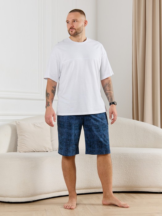 Шорты мужские из трикотажного полотна "кулирка" в клетку, свободного покроя, на притачном поясе с эластичной тесьмой внутри, с карманами в боковых швах. Нижние срезы обработаны подгибкой.