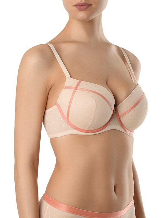 Бюстгальтер серии Galaxy – это легкое жаккардовое полотно в мелкую сеточку с рисунком, напоминающим россыпь звезд в небе, лаконичные тесьмы с атласным блеском и безупречная посадка по фигуре. Преимущества модели:- формованная чашка, на каркасах;- боковые детали стана на подкладке;- элегантная металлическая подвеска в виде буквы «С».