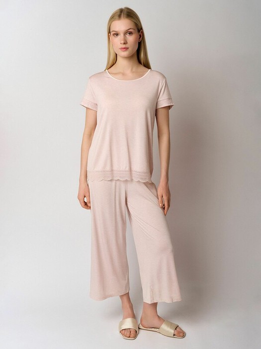 Пижама из мягкого модала с меланжевой фактурой, дополненная романтичной атласной отделкой и кружевом. Брюки длины 7/8 с комфортным поясом на плотной резинке. Передняя часть брюк оформлена атласной каймой.