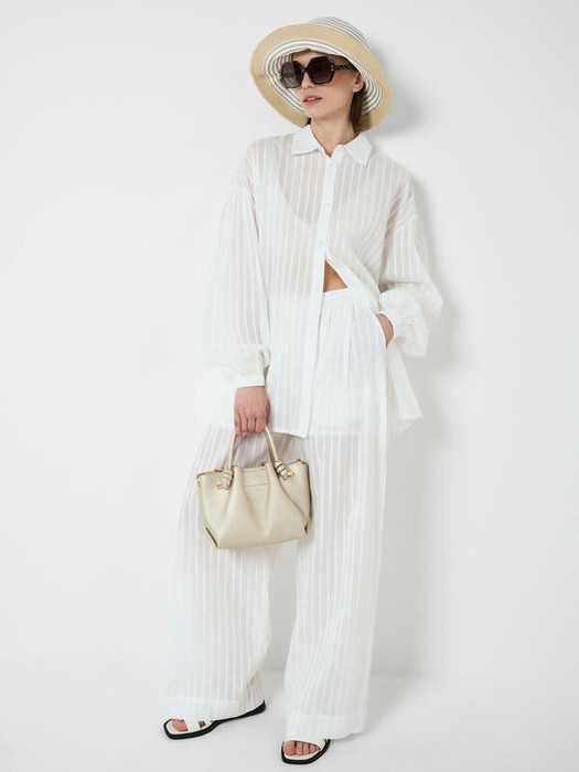 Легкий женский хлопковый костюм. Рубашка свободного прямого кроя с застежкой на пуговицы. Классический воротник и разрезы по бокам. Манжеты на резинке. Широкие брюки палаццо на резинке со шнурком для регулировки. Удобные боковые карманы.
