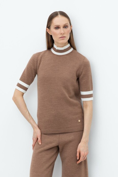 Джемпер в стиле прямой футболки, воротником-стойкой и короткими рукавами. Прямой силуэт, стандартная длина. Средняя плотность вязания, пластичная фактура. Выполнен гладью из мягкой полушерстяной пряжи. Шерсть в составе сохраняет тепло, а благодаря волокнам акрила изделие мягкое и дольше сохраняет форму.