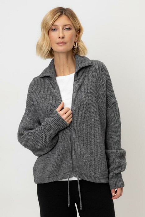 Джемпер вязаный на молнии с объёмными рукавами. Изготовлен из мягкой полушерстяной пряжи. Шерсть в составе сохраняет тепло, акрил делает изделие мягким.