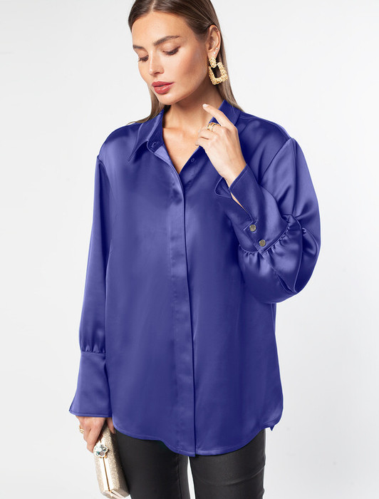 Блузка с удлиненными манжетами выполнена из тончайших нитей плотного сатина, плетение которых создает полуматовый блеск, напоминающий натуральный шёлк. На спинке изделия фирменный логотип бренда. Застежка на золотистые пуговицы. Совет стилиста: сочетайте блузку в костюме с брюками D24.534 и юбкой D26.461 чтобы создать роскошный праздничный образ, с классическими брюками или блестящим денимом.