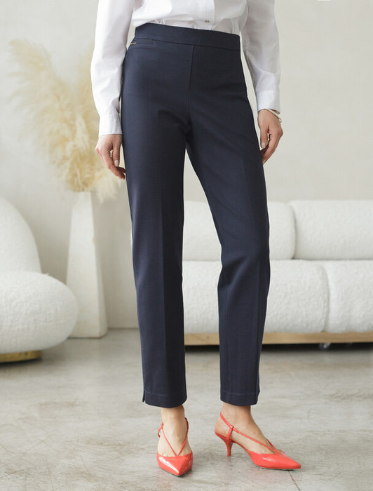 Брюки-дудочки выполнены из джерси. Модель дополнена резинкой сзади, одним вместительным карманом спереди и небольшими боковыми разрезами. Заутюженные стрелки и посадка на талии визуально вытягивают силуэт. Изделие хорошо держит форму, отлично тянется и почти не мнется во время использования. Идеальный вариант в офис или в повседневный классический стиль.