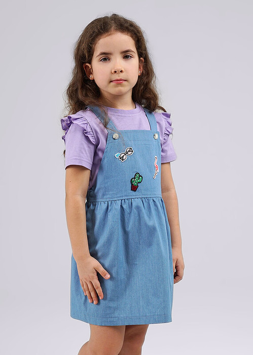 Джинсовый сарафан с яркими шевронами создан для повседневных образов. Регулируемые бретели на пуговицах, расклешеная юбка на резинке обеспечат хорошую посадку. Сарафан прекрасно подойдет для садика или прогулки. Сочетайте модель с яркими футболками.