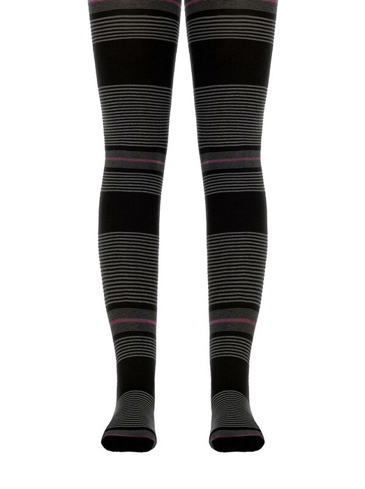 Плотные эластичные фантазийные колготки 50 DEN из нитей микрофибры и LYCRA с горизонтальным рисунком "цветная полоска", комфортный плоский шов, уплотненный мысок. Рекомендация по уходу: на колготках, в составе которых есть нить микрофибры, при попадании влаги может появиться визуальный эффект "неравномерного окраса", который легко устранить: равномерно смочите и высушите колготки.