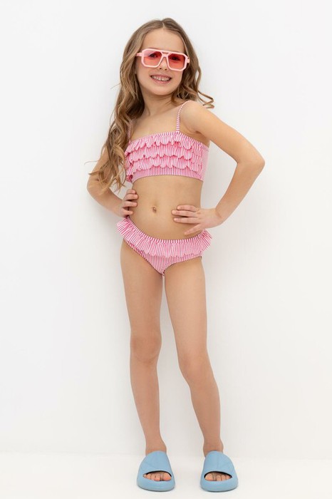 Раздельный купальник для девочки. Топ на эластичных бретелях. Плавки с оборкой на резинке. На груди и спинке воздушные оборки.