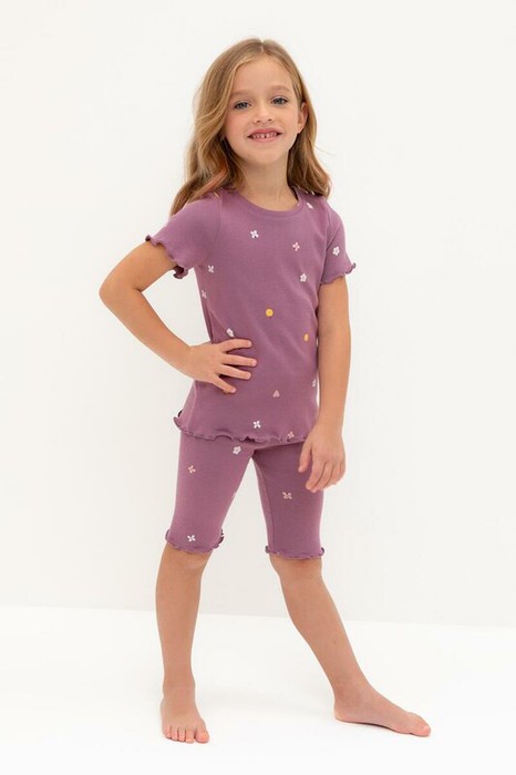 Трикотажная пижама в рубчик из натурального хлопка. Футболка с короткими втачными рукавами и шорты с эластичной резинкой в поясе. Оригинальная набивка выполнена из стойких текстильных гипоаллергенных красителей. Изделие сохраняет цвет и форму после многократных стирок. Все трикотажные полотна производятся в соответсвии с нормами швейцарского сертификата ЭкоТекс.