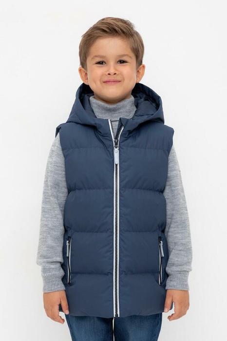 Стеганый жилет с капюшоном для мальчика с утеплителем Fellex®: 120 г/м2. Выполнен из мембранной ткани с дополнительной тефлоновой обработкой. Данный вид обработки предохраняет изделие от загрязнения и лучше отводит влагу. Подклад из 100% полиэстра. Капюшон не снимается. Изделие застёгивается на молнию, предусмотрена защита подбородка. Два кармана по бокам застёгиваются на молнии. Во всех изделиях верхнего ассортимента для безопасности ребенка предусмотрены светоотражающие элементы.
