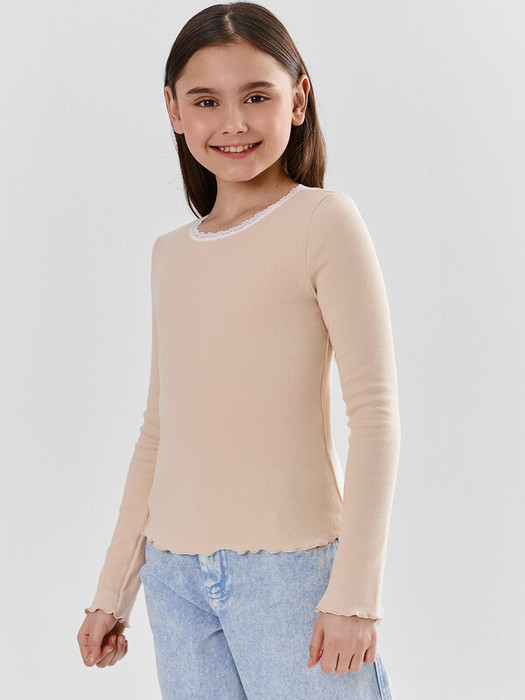 Лонгслив для девочек, прямого силуэта. Горловина округлой формы, обработана узким кружевом. L153-1.5 (84% полиамид; 16% эластан). Рукав втачной длинный. Низ изделия и рукавов обработан на микрооверлоке.