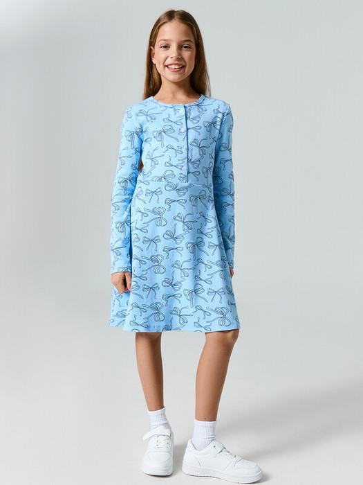 Платье полуприлегающего силуэта. С отрезной юбкой выше талии. Рукава втачные длинные. Горловина круглая, окантована бейкой из основного полотна. По переду застежка на пуговицы (d= 10 mm.) Низ изделия и рукавов обработан на 2-х игольной плоскошовной машине швом в подгибку.