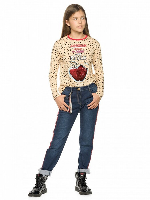 Джинсы для девочек с начёсом прямого силуэта, по бокам брючин декоративная капроновая тесьма с пайетками, по переду изделия золотистый карабин с принтованной репсовой тесьмой, перевод надписи Доверяй своему творчеству, пояс с внутренней регулировкой шнурком.