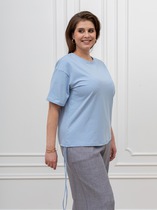 Boyfriend крой, круглый вырез. Втачной рукав. Горловина из рибаны. отстрочена по переду. Плечевые швы и шов горловины спинки укреплены бейкой из основной ткани.