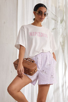 Укороченная футболка, спущенное плечо.Укрепление плечевых швов и шва горловины бейкой из основной ткани. Горловина из рибаны.