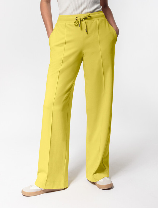 Брюки выполнены из тонкого хлопкового футера. Эластичный материал хорошо пропускает воздух, позволяя телу дышать, и легко тянется, не ограничивая движения. Пояс на резинке дополнен шнуром с золотистой фурнитурой. Свободная модель с застроченными стрелками визуально вытягивает силуэт. Можно носить даже с обувью на каблуке, блузками и топами, а также в костюме с футболкой D49.003 и худи D49.006