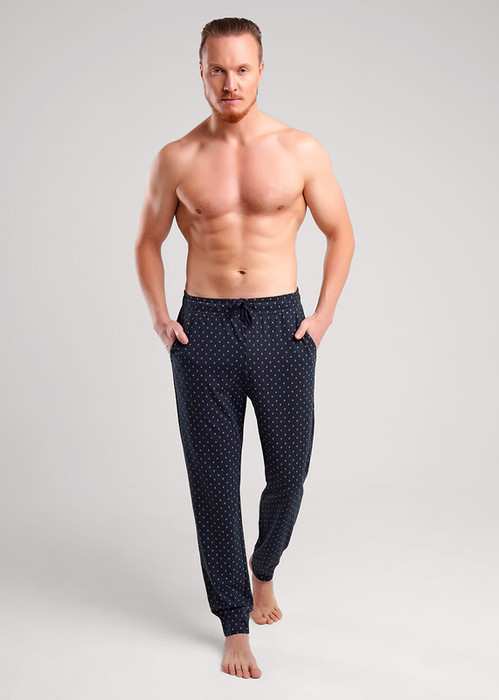 Мужские домашние брюки на манжете из хлопковой глади в дизайнерскую набивку. Комфортные брюки хорошо держат форму и не сковывают движений. Отличное решение для домашнего образа.