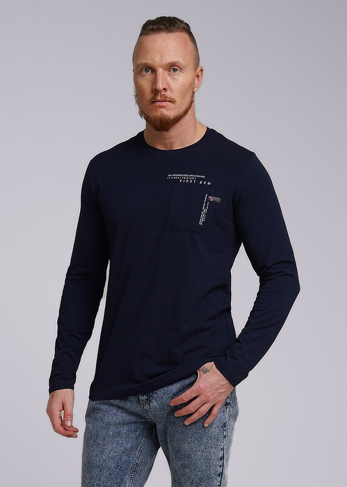Лонгслив мужской с округлой горловиной и карманом. Прекрасно впишется в любой гардероб, станет отличным дополнением к брюкам или джинсам. Интересное звучание модели придает дизайнерская нашивка и принт.