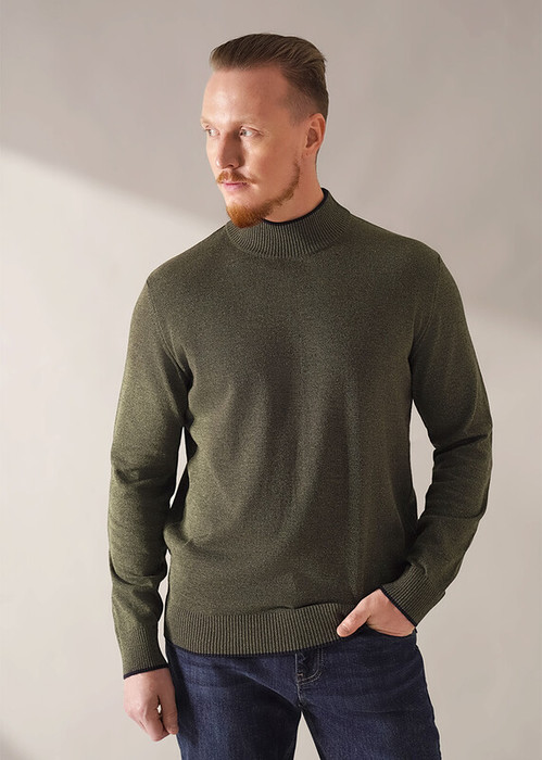 Джемпер мужской из смесовой хлопковой пряжи с длинным рукавом и воротником стойкой. Прекрасно сохраняет тепло, комфортный в носке, отличное решение на прохладное время года. Комбинируется с джинсами или брюками.