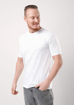 Фуфайка с коротким рукавом среднего объема, круглым вырезом горловины, которая оформлена обтачкой из рибаны, выполненная из набивного полотна.
