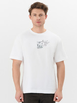 Фуфайка с коротким рукавом среднего объема, с оригинальным принтом, круглым вырезом горловины, которая оформлена обтачкой из рибаны.