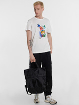 Фуфайка с коротким рукавом среднего объема, с оригинальным принтом, круглым вырезом горловины, которая оформлена обтачкой из рибаны.