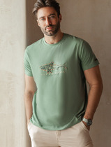 Фуфайка с коротким рукавом среднего объема, с оригинальным принтом, круглым вырезом горловины, которая оформлена обтачкой из рибаны.