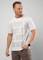 Фуфайка с коротким рукавом среднего объема, с оригинальным принтом, круглым вырезом горловины, которая оформлена обтачкой из рибаны.