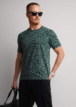 Фуфайка с коротким рукавом среднего объема, круглым вырезом горловины, которая оформлена обтачкой из рибаны.